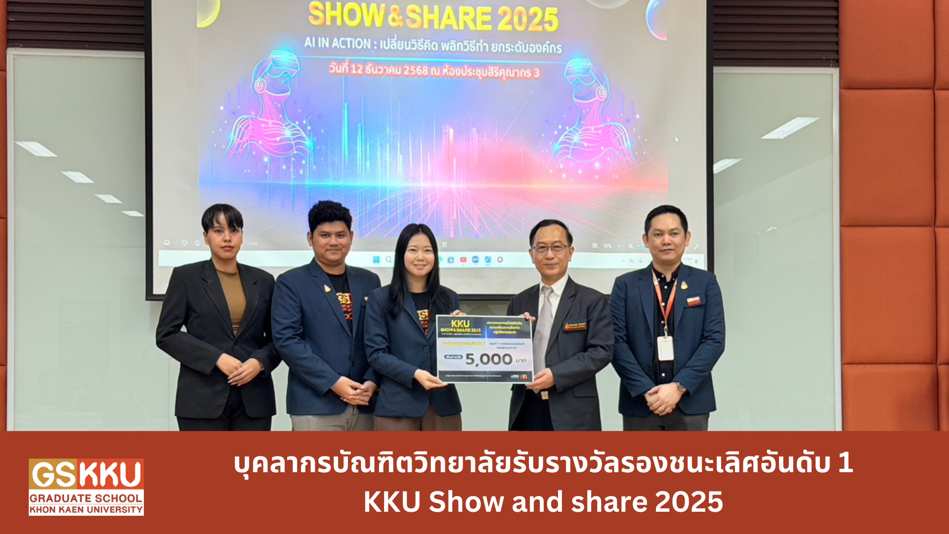 ขอแสดงความยินดีกับบุคลากรบัณฑิตวิทยาลัยรับรางวัลรองชนะเลิศอันดับ 1 KKU Show and Share 2025 วันที่ 12 ธันวาคม พ.ศ. 2568 ณ ห้องประชุมสิริคุณากร 3 ชั้น 2 อาคารสิริคุณากร สำนักงานอธิการบดี