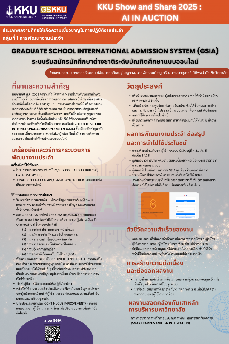รางวัลรองชนะเลิศอันดับ 1 เงินรางวัล 5,000 บาท ประเภทผลงานที่ก่อให้เกิดความเชี่ยวชาญในการปฏิบัติงานประจำ กลุ่มที่ 1 การพัฒนางานประจำ ชื่อผลงาน Graduate School International Admission System (GSIA) ระบบรับสมัครนักศึกษาต่างชาติระดับบัณฑิตศึกษาแบบออนไลน์ ผู้ส่งผลงาน/เจ้าของผลงาน นางสาวศรัณยา แซ่จัง นายอภิเชษฐ์ บุญจวง นายพัทดนย์ ธนูเสริม และนางสาวสุชาวลี นิติพจน์