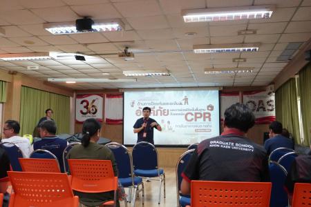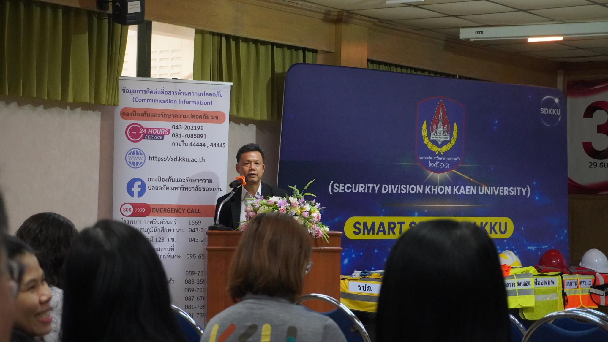รศ.นสพ.ดร.ชูชาติ กมลเลิศ ผู้อำนวยการสำนักบริการวิชาการ กล่าวเปิดโครงการ จากนั้น นายมรกต สุบิน รักษาการผู้อำนวยการกองป้องกันและรักษาความปลอดภัย บรรยายเรื่อง แนวทางการจัดการความเสี่ยงด้านสาธารณภัย(Disaster Risk Management) ในอาคารสูง และการบริหารความต่อเนื่อง (BMC) และนายวิบูรณ์ศิลป์ พินิจมนตรี หัวหน้างานป้องกันและบรรเทาสาธารณภัย บรรยายและดำเนินการปฏิบัติการกลุ่มเรื่อง ทักษะเบื้องต้นด้านการป้องกันและระงับอัคคีภัย ในช่วงบ่ายเป็นการบรรยายแบบฐานให้ความรู้ วิทยากรจากศูนย์หัวใจสิริกิติ์ ภาคตะวันออกเฉียงเหนือ แบ่งเป็น 2 ฐาน ฐานที่ 1 ความรู้พื้นฐานการช่วยฟื้นคืนชีพขั้นพื้นฐาน ฐานที่ 2 การสาธิตขั้นตอนการช่วยฟื้นคืนชีพขั้นพื้นฐานและการใช้เครื่อง AED จากนั้นแบ่งกลุ่มฝึกปฏิบัติและสอบปฏิบัติการช่วยฟื้นคืนชีพขั้นพื้นฐานและการใช้เครื่อง AED