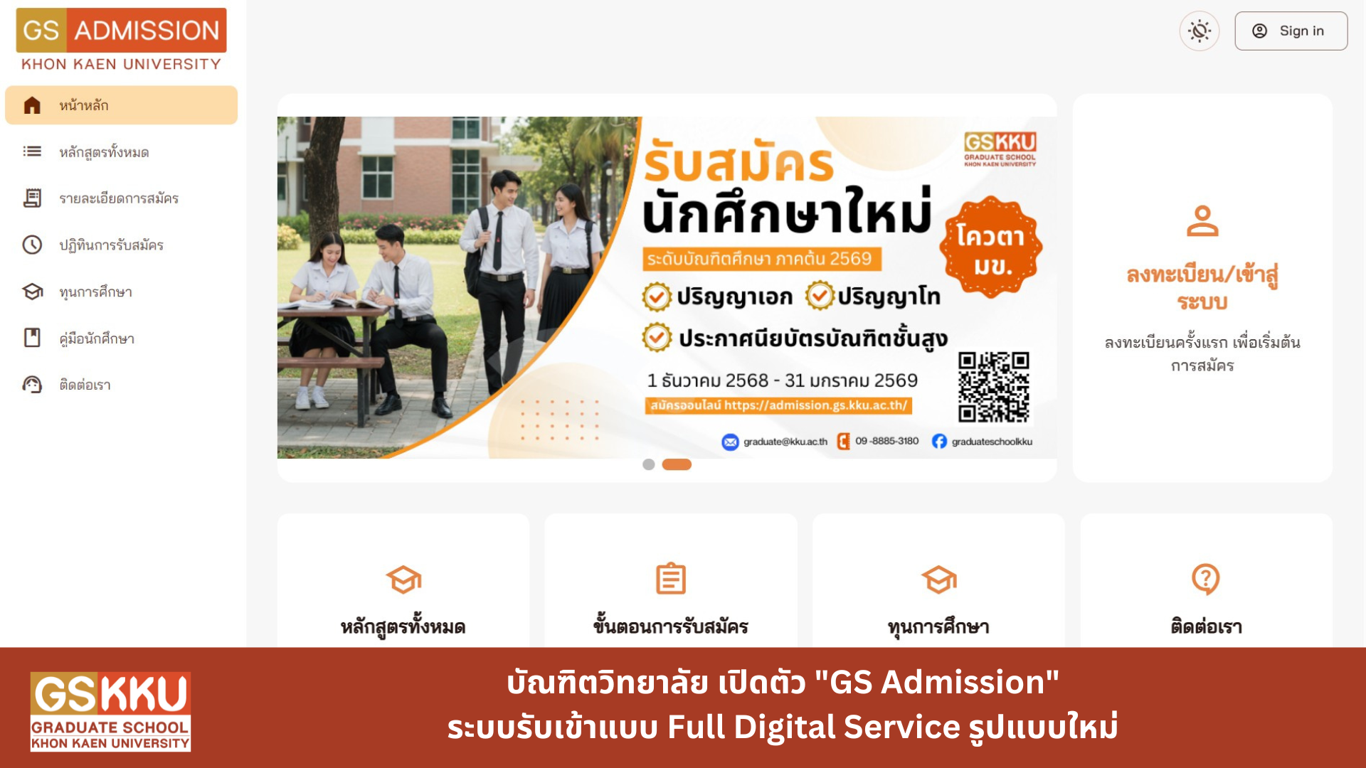 บัณฑิตวิทยาลัย มหาวิทยาลัยขอนแก่น เริ่มใช้ระบบการรับเข้าแบบ Full Digital Service รูปแบบใหม่ผ่าน "GS Admission" ที่ออกแบบเพื่ออำนวยความสะดวกสูงสุดให้กับผู้สมัครเข้าศึกษาต่อระดับบัณฑิตศึกษา ด้วยคุณสมบัติที่ทันสมัย เช่น การยืนยันตัวตนผ่านทั้ง Email และ ThaiD ระบบบันทึกข้อมูลที่สามารถเข้ามากรอกได้หลายครั้งก่อนส่งใบสมัคร การเชื่อมต่อระบบการชำระเงินที่รวดเร็ว รองรับการสมัครมากกว่า 1 หลักสูตรในครั้งเดียว พร้อมระบบดูผลการสอบและแสดงสถานะต่างๆ ได้แบบ Real-time